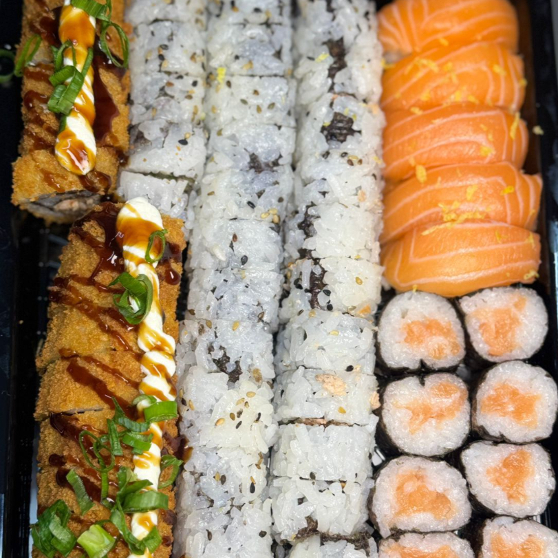 15 hot holl, 10 uramaki grelhado, 10 hossomaki de salmão, 5 niguiri, 10 uramaki skin e 10 uramaki california