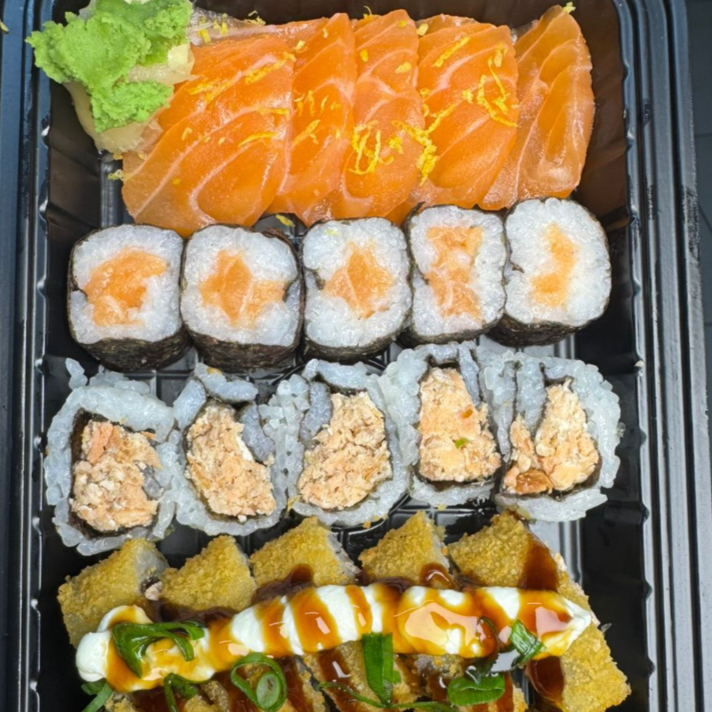 5 sashimis, 5 hossomakis, 5 uramakis de salmão grelhado e 10 hot holls.