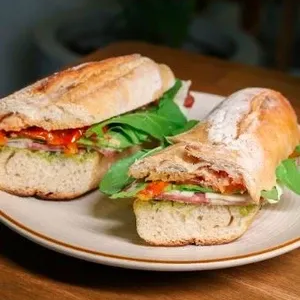 Pão baguete, molho pesto de castanha do Pará, salame, mozarela, tomate confit e rúcula.