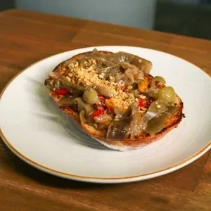 Pão de fermentação natural chapeado no azeite, antepasto de berinjela com pimentões coloridos, alho, cebola, azeitona, azeite, finalizado com alho frito.