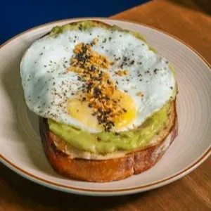 Pão de fermentação natural chapeado na manteiga aromatizada, guacamole, ovo frito temperado com sal e pimenta do reino, finalizado com alho frito e gergelim