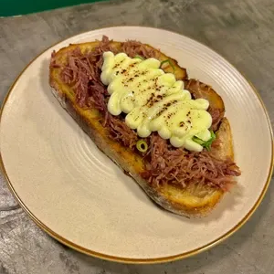 Pão de fermentação natural chapeado na manteiga aromatizada, carne seca temperada e requeijão cremoso maçaricado.