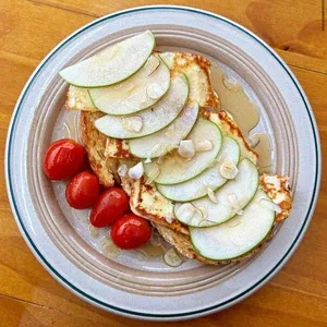 Pão de fermentação natural chapeado na manteiga aromatizada, queijo coalho gratinado, fatias de maçã verde, finalizado com castanhas do Pará, mel e tomate confit.