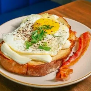 Pão de fermentação natural chapeado na manteiga aromatizada, catupiry, ovo com queijo parmesão tostado, acompanhado de uma fatia de bacon e finalizado com cebolinha.