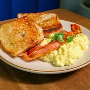 Pão Ciabatta chapeado na manteiga aromatizada, ovos mexidos cremoso, acompanha fatia de bacon, finalizado com cebolinha.