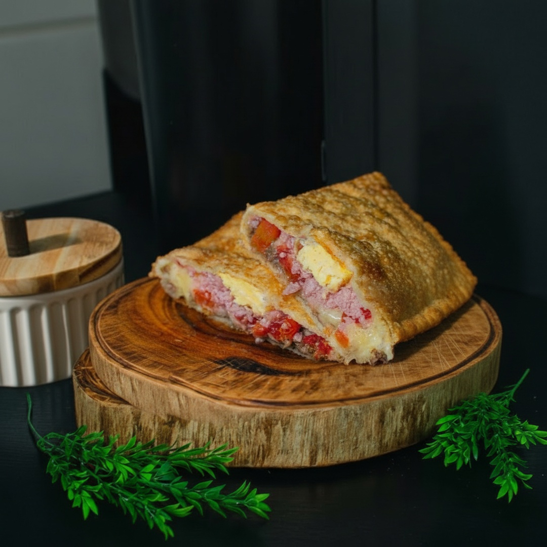 Uma explosão de sabor: Queijo Mussarela com Presunto de Alta Qualidade, Ovo Cozido, Tomate e Azeitona picados e um toque de Orégano. Massa crocante e sequinha, Pastel de 20x10cm, recheado de ponta a ponta, preparado e frito na hora.