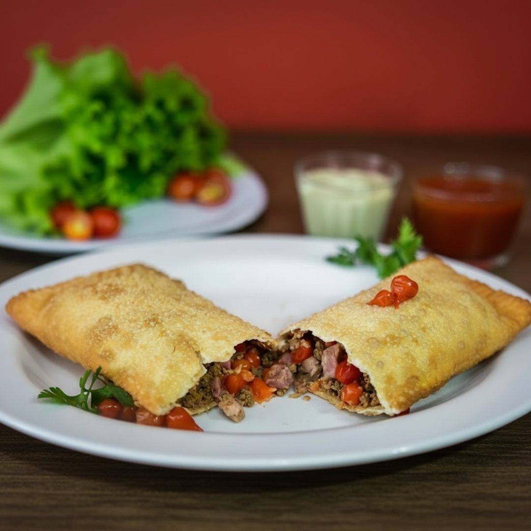 Nossa suculenta carne moída com ovo cozido, tomate picado, azeitona picada e queijo Catupiry. São 25x10cm de massa crocante, sequinha, recheada de ponta a ponta, preparado e frito na hora.