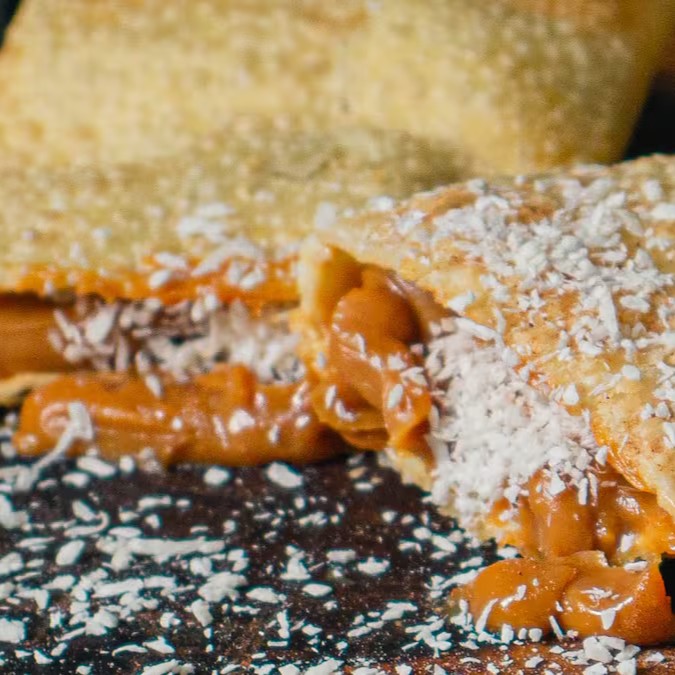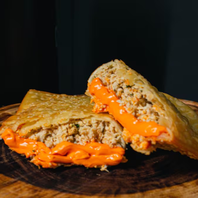 Escolha 2 tipos de recheio e turbine com 2 adicionais. É muuuuito recheio! São 25x10cm de massa crocante, sequinha, recheada de ponta a ponta, preparado e frito na hora.
