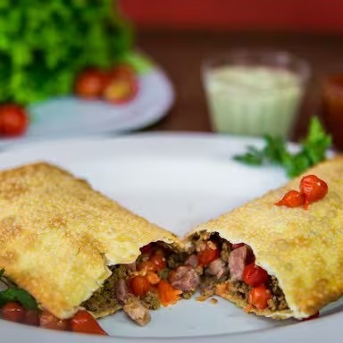 Nossa suculenta carne moída com ovo cozido, tomate picado, azeitona picada e queijo Catupiry. São 25x10cm de massa crocante, sequinha, recheada de ponta a ponta, preparado e frito na hora.