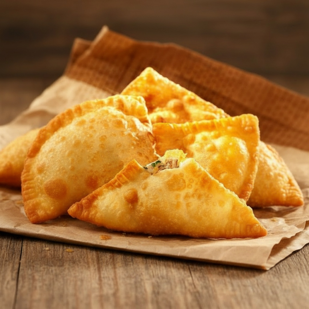 Massa crocante e sequinha, recheado de ponta a ponta, preparado e frito na hora!