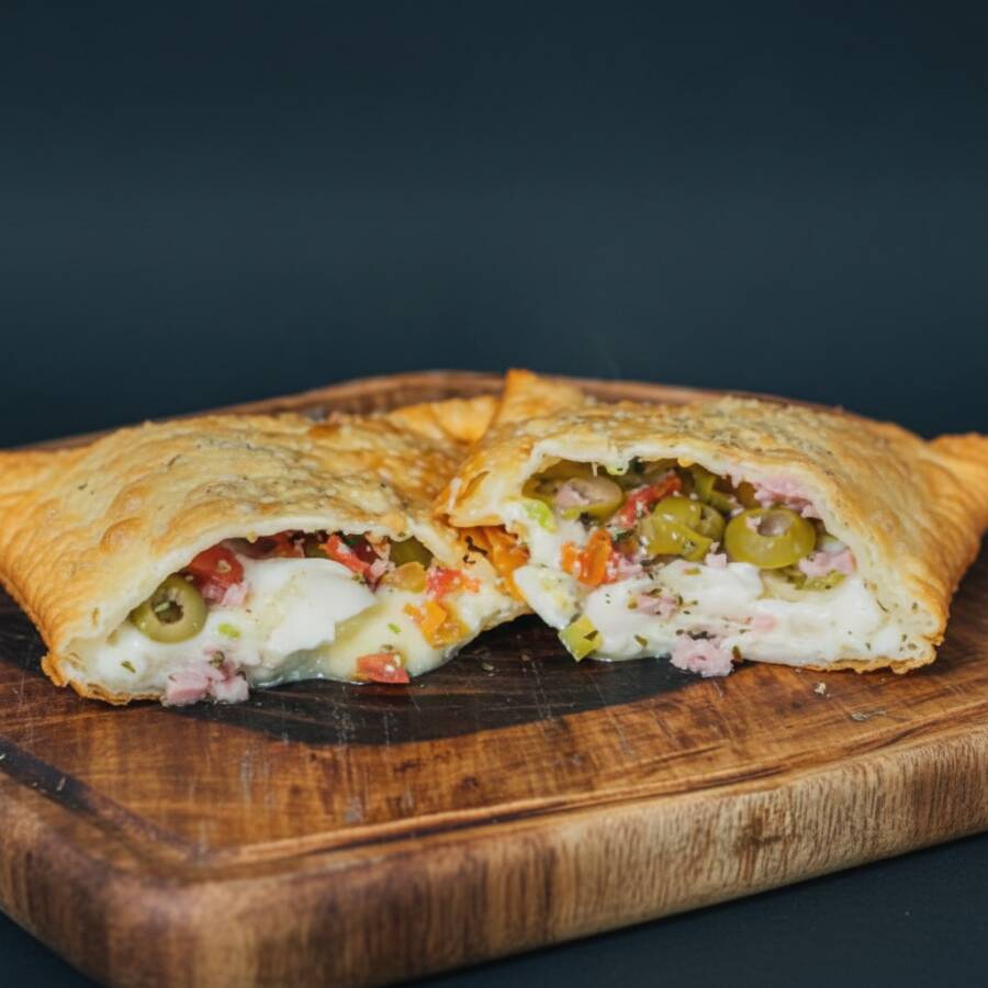 Carne moida, mussarela, presunto, ovo, tomate, azeitona, em nossa massa crocante no tamanho de 25x10 centimetros