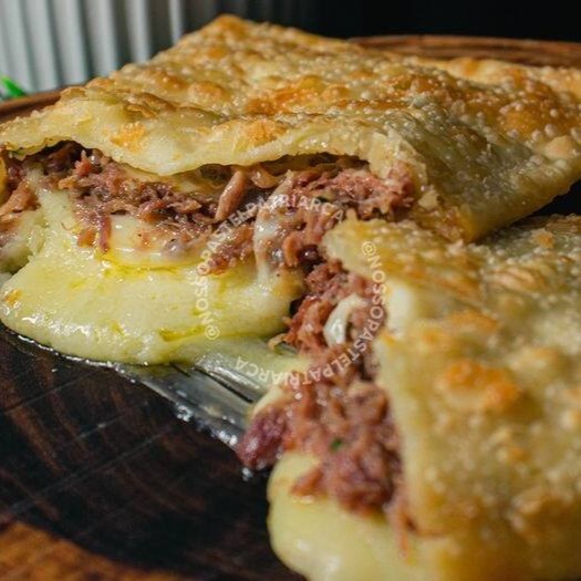 Cupim desfiado com queijo mussarela. Massa crocante e sequinha, Pastel de 20x10cm, recheado de ponta a ponta, preparado e frito na hora.