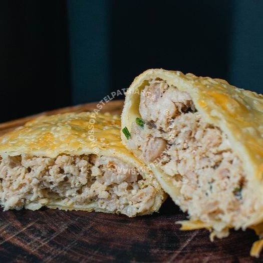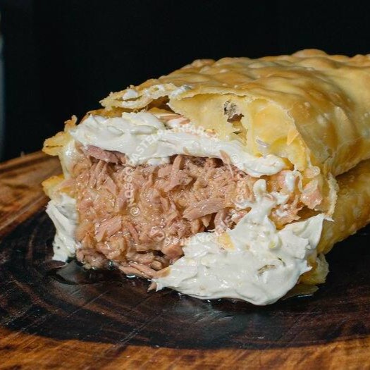 Atum com queijo cream cheese, em uma massa crocante e sequinha, preparado e frito na hora, recheado de ponta a ponta. Pastel de 20x10cm preparado e frito na hora.