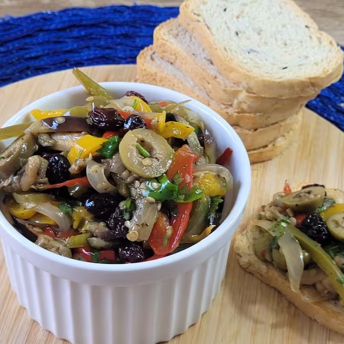 Essa salada é um sucesso e vc não pode deixar de experimentar! Salada de Berinjela assada no forno com pimentão verde, amarelo e vermelho, azeitonas, azeite de oliva e temperos especiais, que se unem nessa explosão de sabores! . Porção de ± 60g. Imagem ilustrativa.