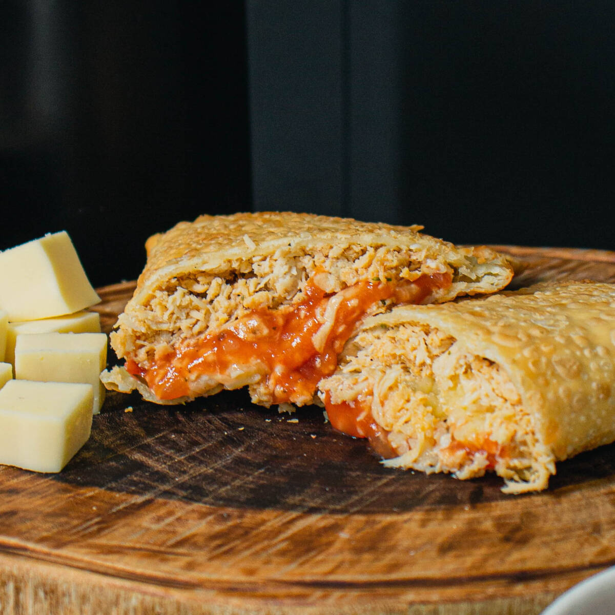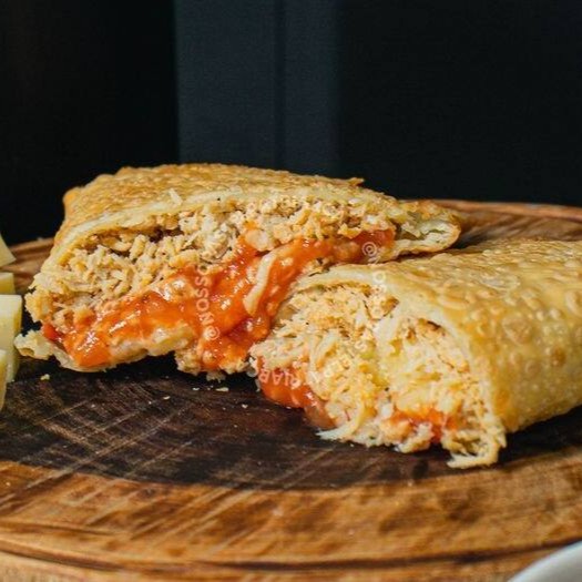 Nosso delicioso frango com queijo mussarela e molho de tomate. São 25x10cm de massa crocante, sequinha, recheada de ponta a ponta, preparado e frito na hora.