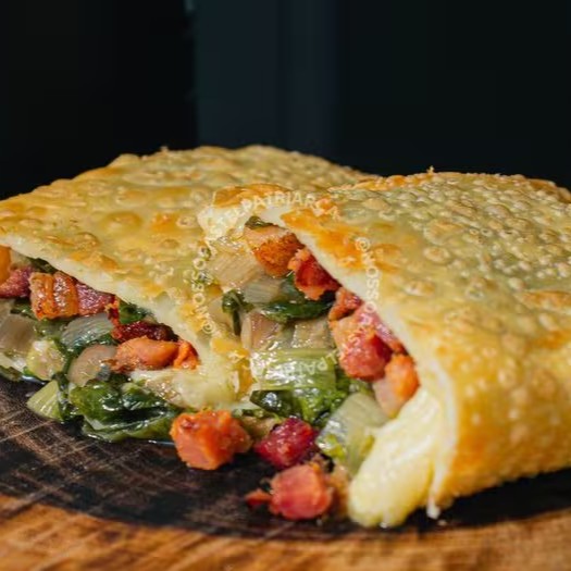 Escarola refogada com queijo mussarela e bacon. Massa crocante e sequinha, Pastel de 20x10cm, recheado de ponta a ponta, preparado e frito na hora.