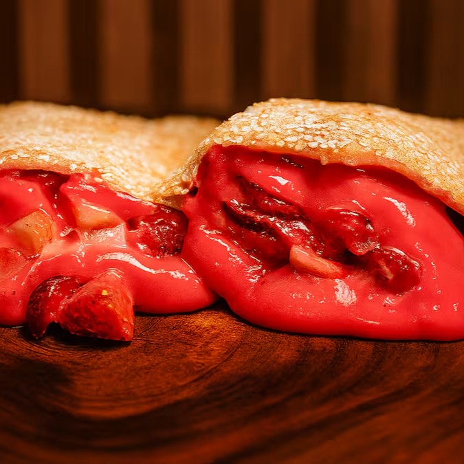 O nosso pastel de Morangoffee é tão delicioso que você não vai conseguir parar de comer! O recheio de morangos, doce de leite e marshmallow é cremoso e saboroso, e a massa crocante e sequinha é a combinação perfeita. Pastel de 20x6cm, recheado de ponta a ponta, preparado e frito na hora.