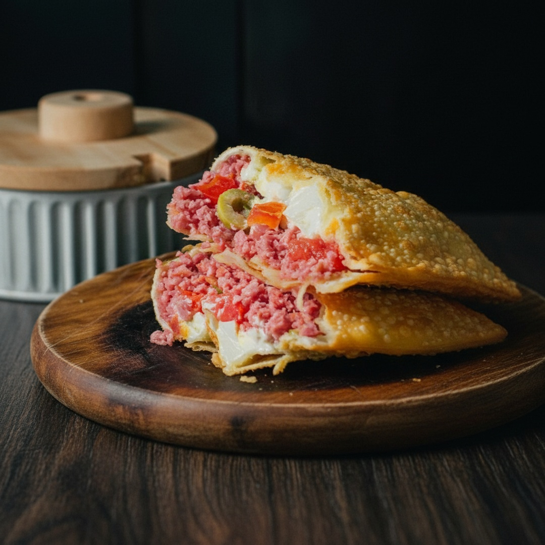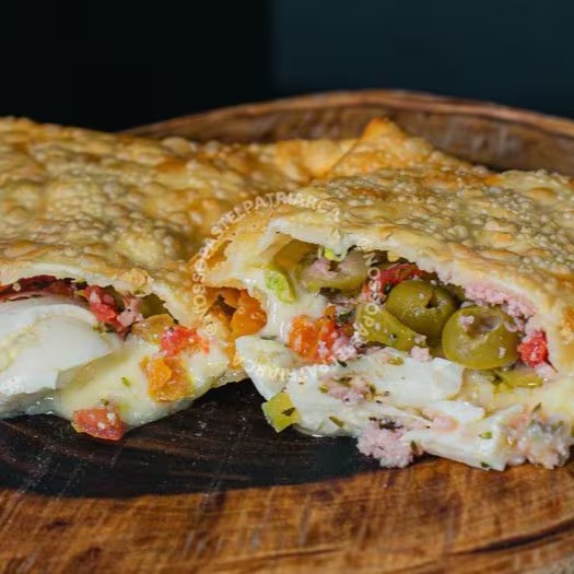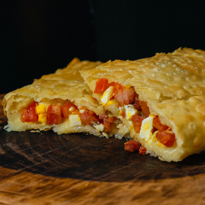 Pastel de Portuguesa, uma deliciosa combinação de queijo mussarela, presunto de alta qualidade, tomate picado, azeitona picada, ovo cozido e orégano.