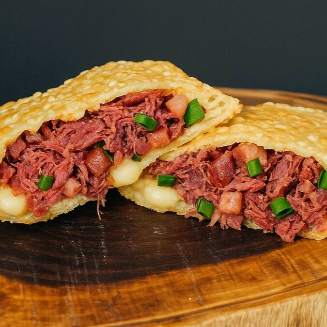 Uma combinação irresistível de carne seca desfiada, queijo coalho, bacon e cebolinha. Um sabor nordestino marcante dentro de um pastel de 20x10cm, massa sequinha e crocante, recheado da primeira a ultima mordida, preparado e frito na hora.
