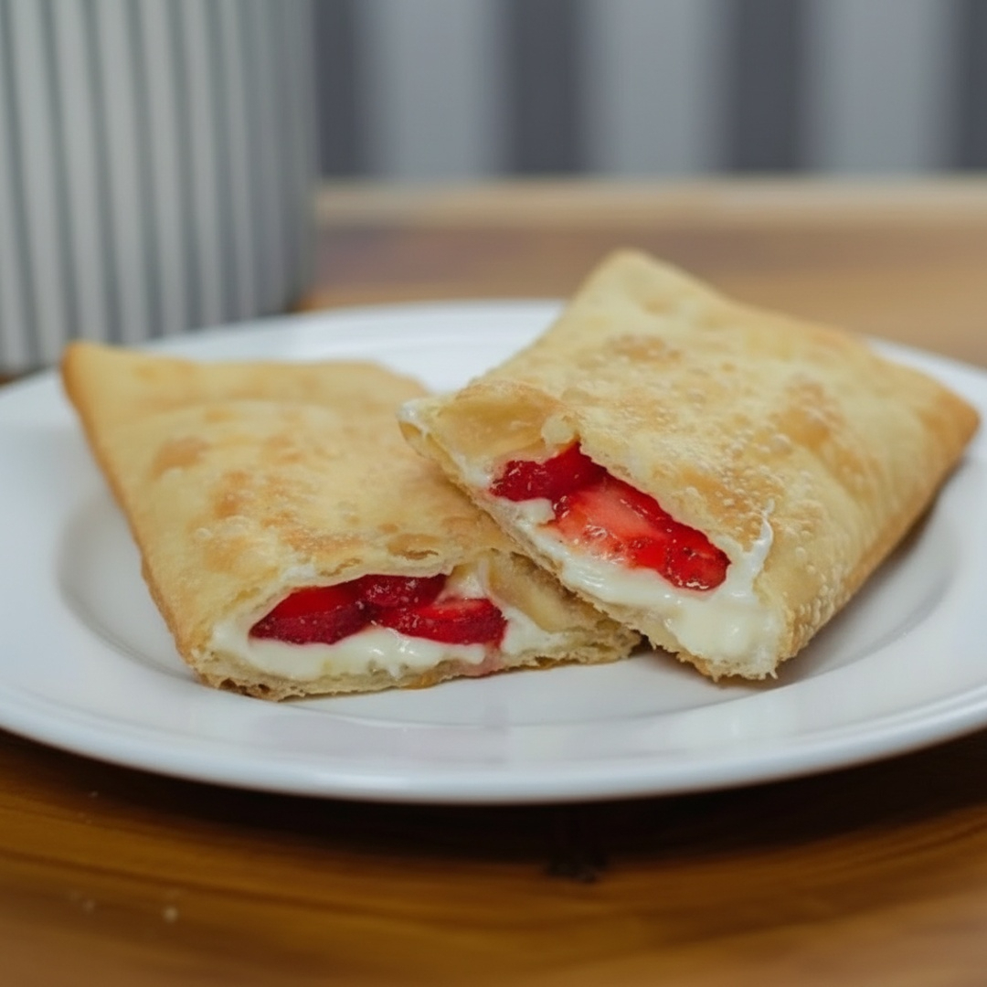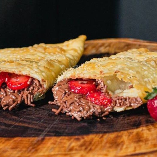 O nosso delicioso brigadeiro com morangos frescos picados. Massa crocante e sequinha, Pastel de 20x6cm, recheado de ponta a ponta, preparado e frito na hora.