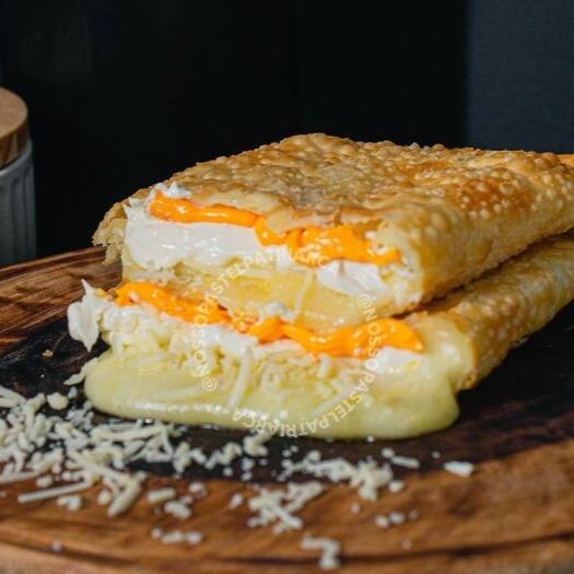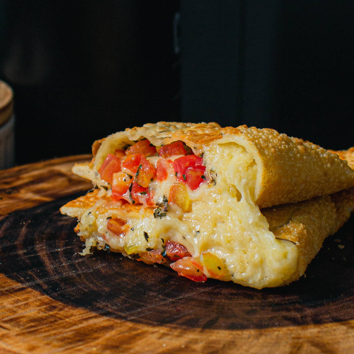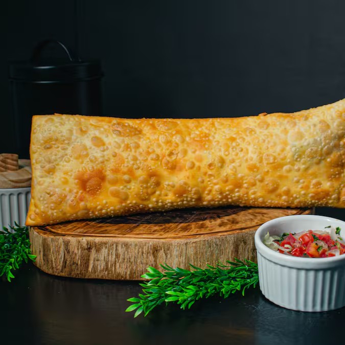 Uma explosão de sabor em cada mordida! Você escolhe sua dupla perfeita de mussarela com: Catupiry Ou Cream Cheese Ou Cheddar Ou Parmesão. Massa dourada, crocante e sequinha, recheio generoso de ponta a ponta e frito na hora. Tamanho: 20x10cm | Imagem ilustrativa.