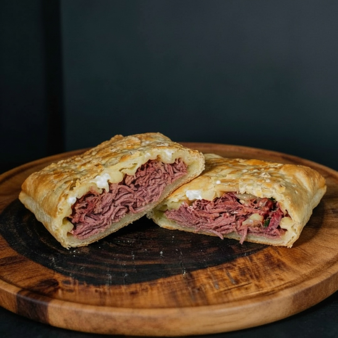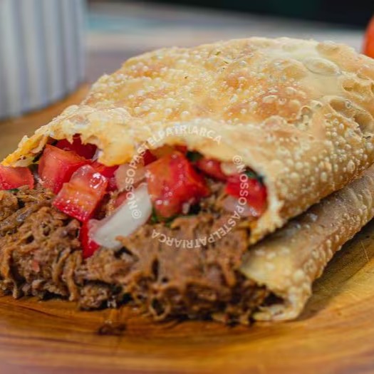 A carne louca é um clássico da culinária brasileira, e este pastel é a maneira perfeita de saboreá-la. A nossa massa crocante e sequinha é recheada com uma deliciosa mistura de carne bovina desfiada e temperos especiais. O vinagrete dá um toque especial, deixando-o ainda mais saboroso! Apenas experimente essa combinação! Pastel de 20x10cm, recheado de ponta a ponta, preparado e frito na hora.