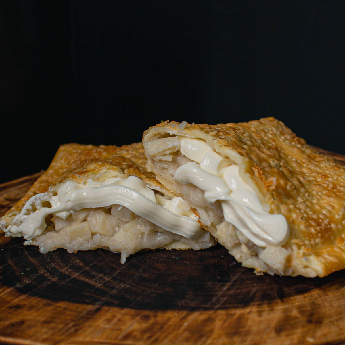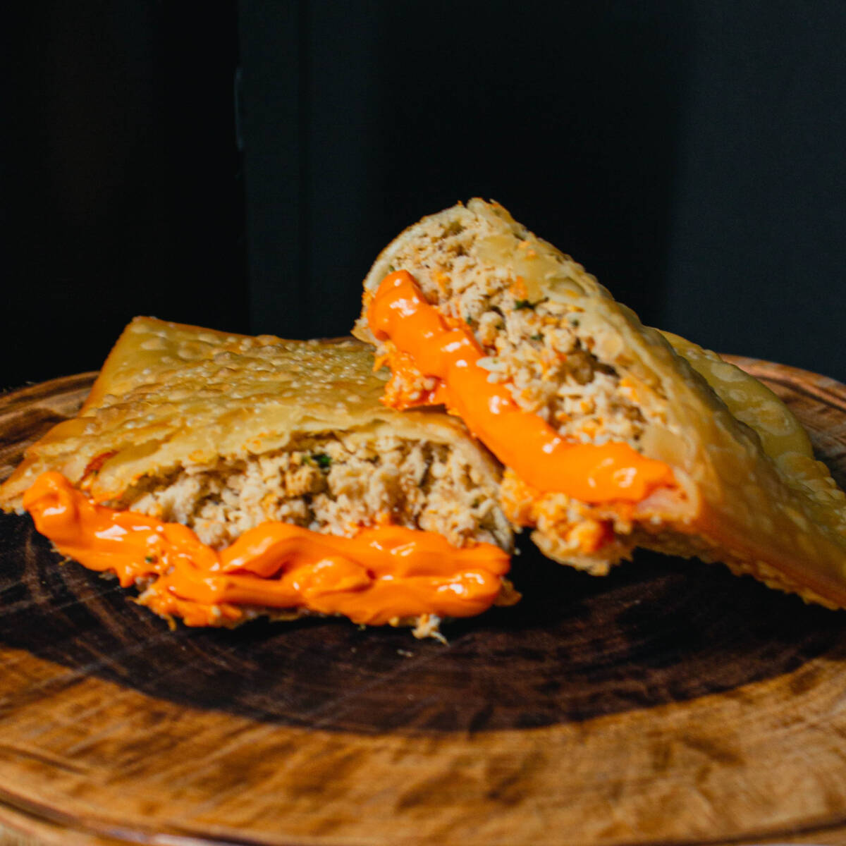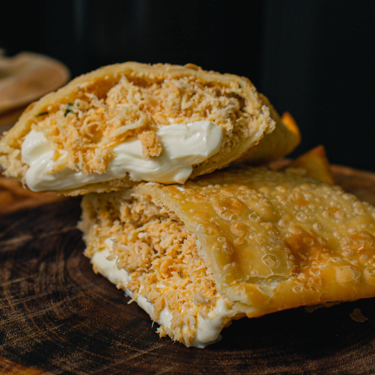 Massa crocante, recheio de ponta a ponta, preparado e frito na hora.