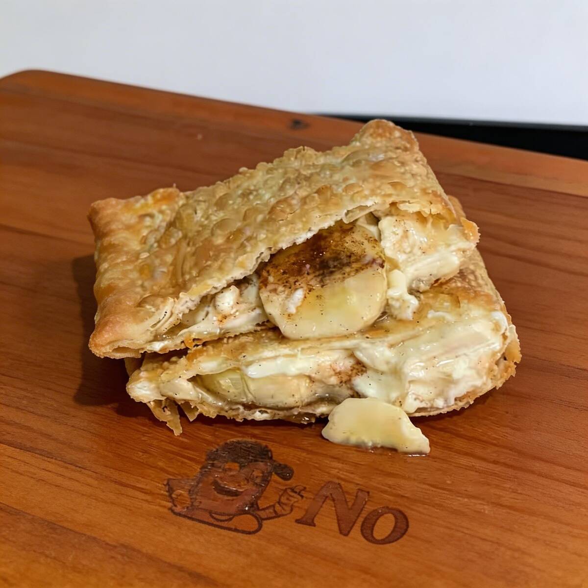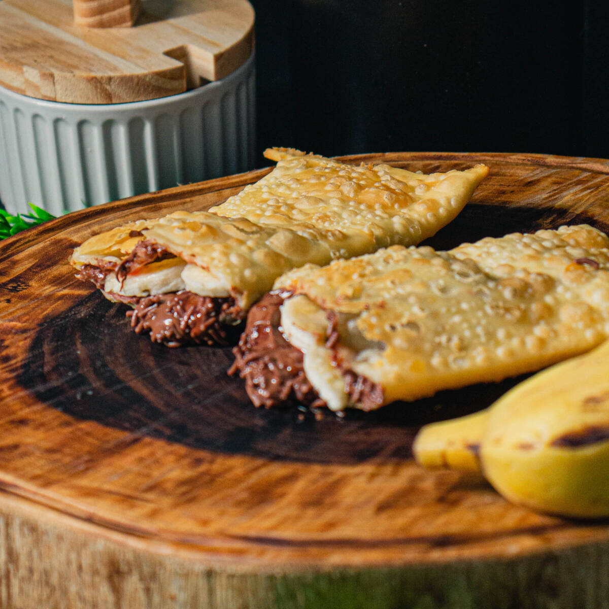 Bananas em rodelas, chocolate branco, açúcar e canela. Massa crocante e sequinha. Pastel de 20x6cm (menor que o pastel salgado), recheado de ponta a ponta, preparado e frito na hora.