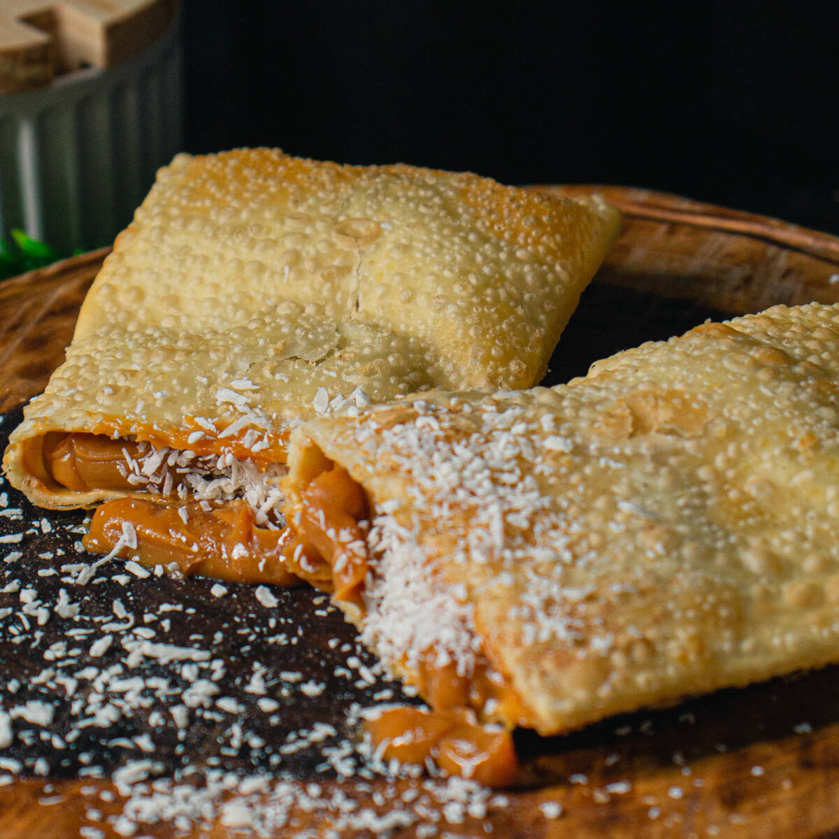 Traz o sabor da tapioca para dentro do pastel, inspirado nas feiras do Nordeste: queijo mussarela, coco ralado e leite condensado em perfeita harmonia. Massa crocante, recheio de ponta a ponta, preparado e frito na hora. Tamanho: 20x6cm | Imagem ilustrativa.