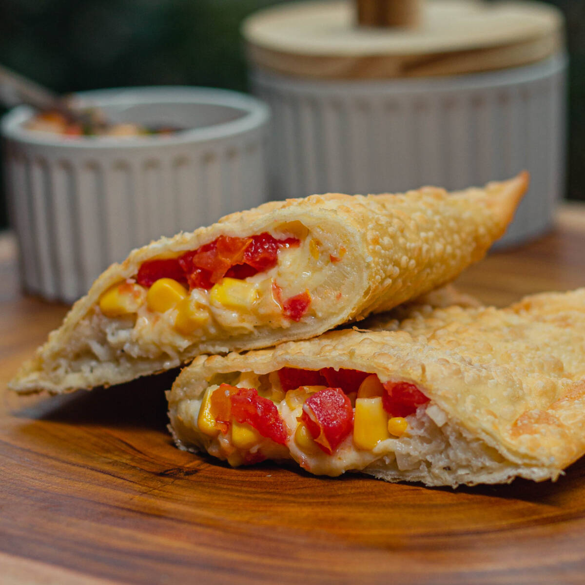 Nosso delicioso creme de palmito picado, tomate picado, milho cozido e queijo mussarela. Creme de palmito preparado com palmito picado, farinha de trigo, água e temperos. São 25x10cm de massa crocante, sequinha, recheada de ponta a ponta, preparado e frito na hora.