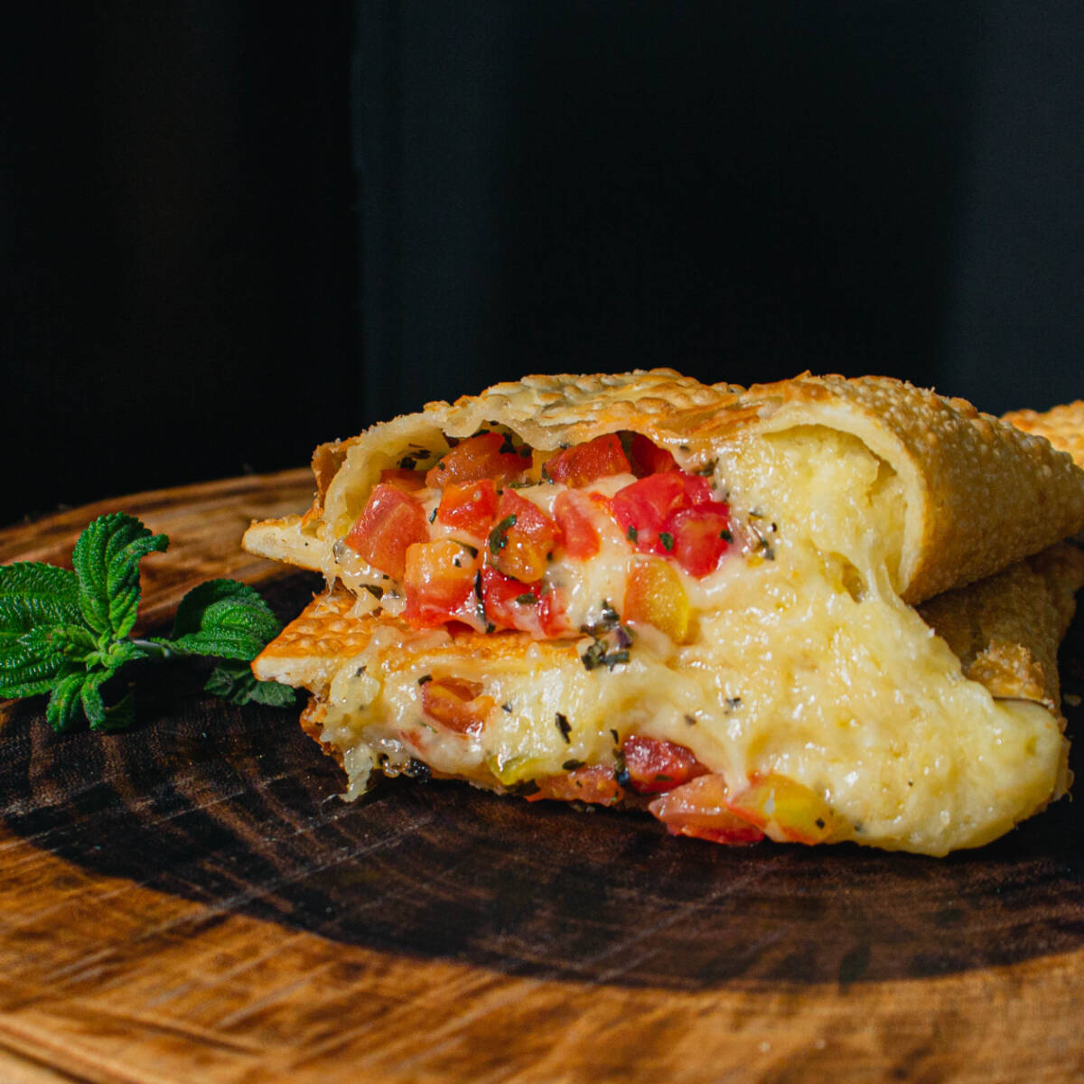 O classico mais pedido! Queijo Mussarela com Tomate picado e um toque de Orégano. Massa crocante e sequinha, Pastel de 20x10cm, recheado de ponta a ponta, preparado e frito na hora.