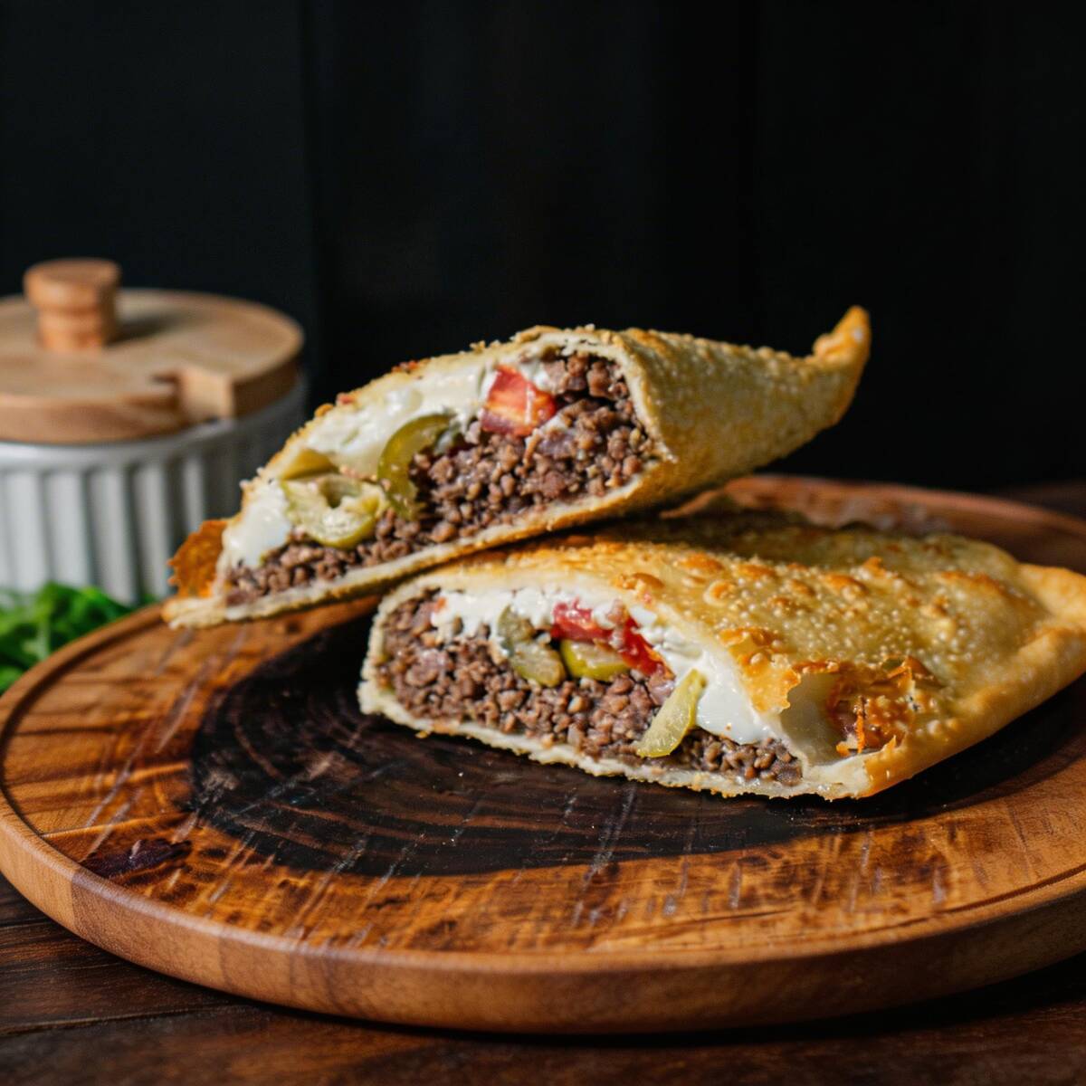 Nossa suculenta carne moída com ovo cozido, tomate picado, azeitona picada e Catupiry. São 25x10cm de massa crocante, sequinha, recheada de ponta a ponta, preparado e frito na hora.
