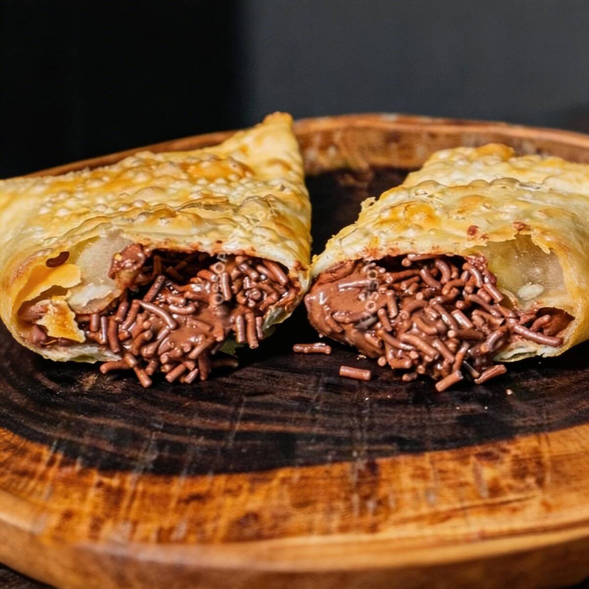 O nosso delicioso brigadeiro, com uma Massa crocante e sequinha, Pastel de 20x6cm, recheado de ponta a ponta, preparado e frito na hora.