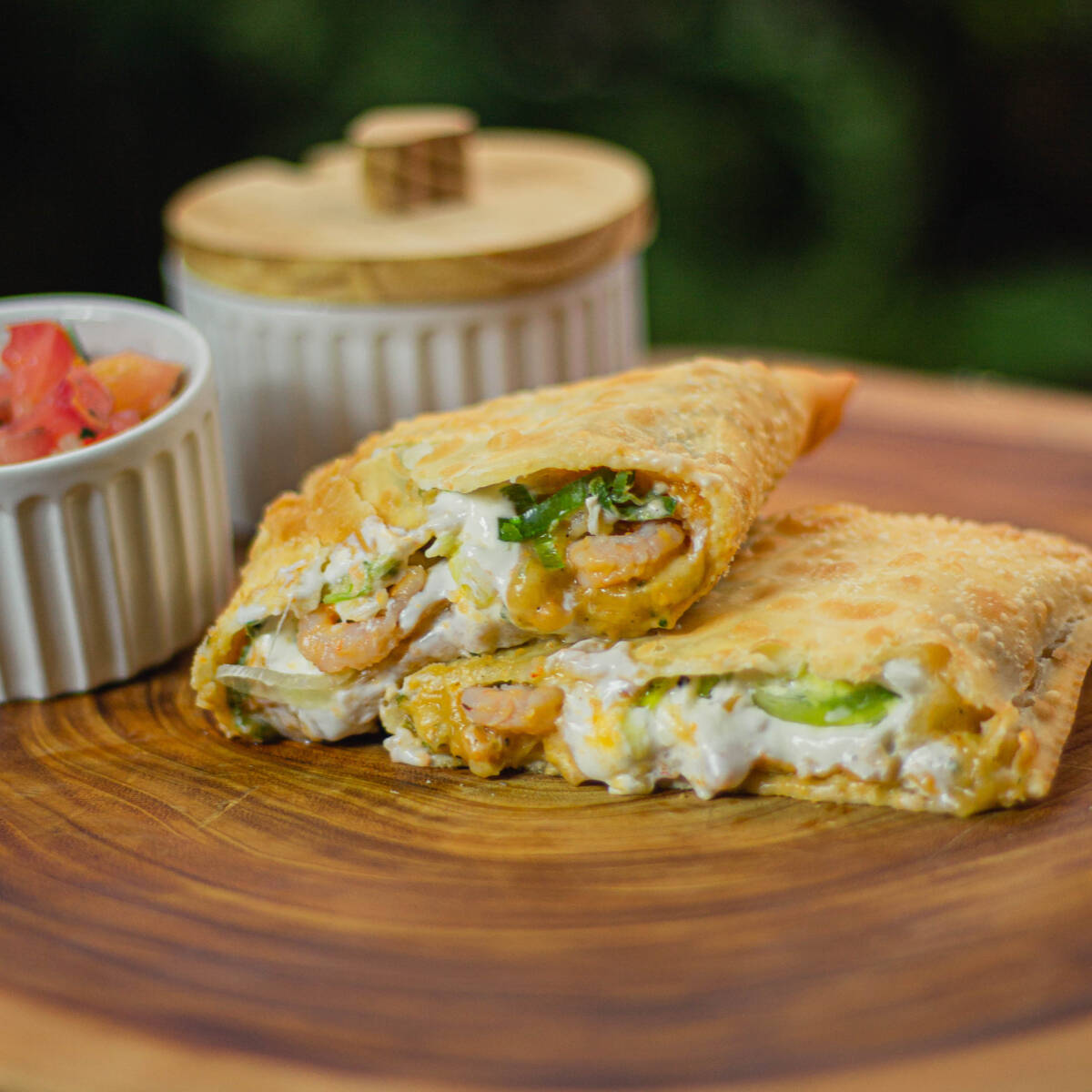 Recheio de camarão cremoso com Cream Cheese e alho poró. Massa crocante e sequinha, Pastel de 20x10cm, recheado de ponta a ponta, preparado e frito na hora.