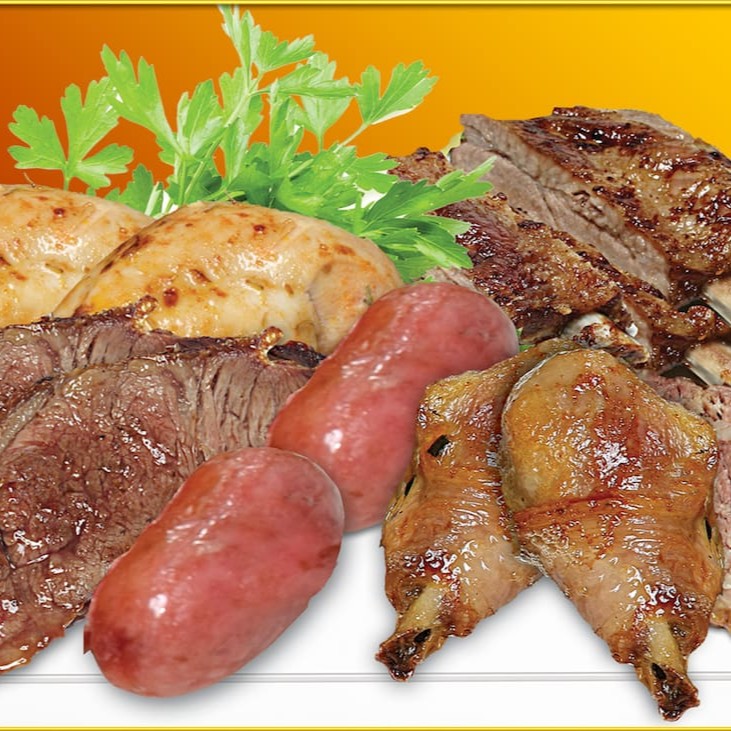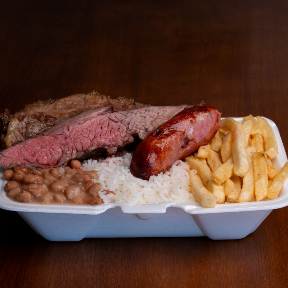 Churrasco Mista de Fraldinha e Linguiça assados na brasa com Arroz soltinho, Feijão bem temperado e Fritas.