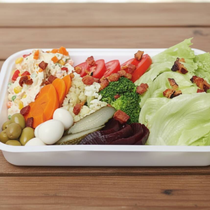 Salada de Alface, Tomate, Cenoura, Brócolis, Beterraba e Azeitona.