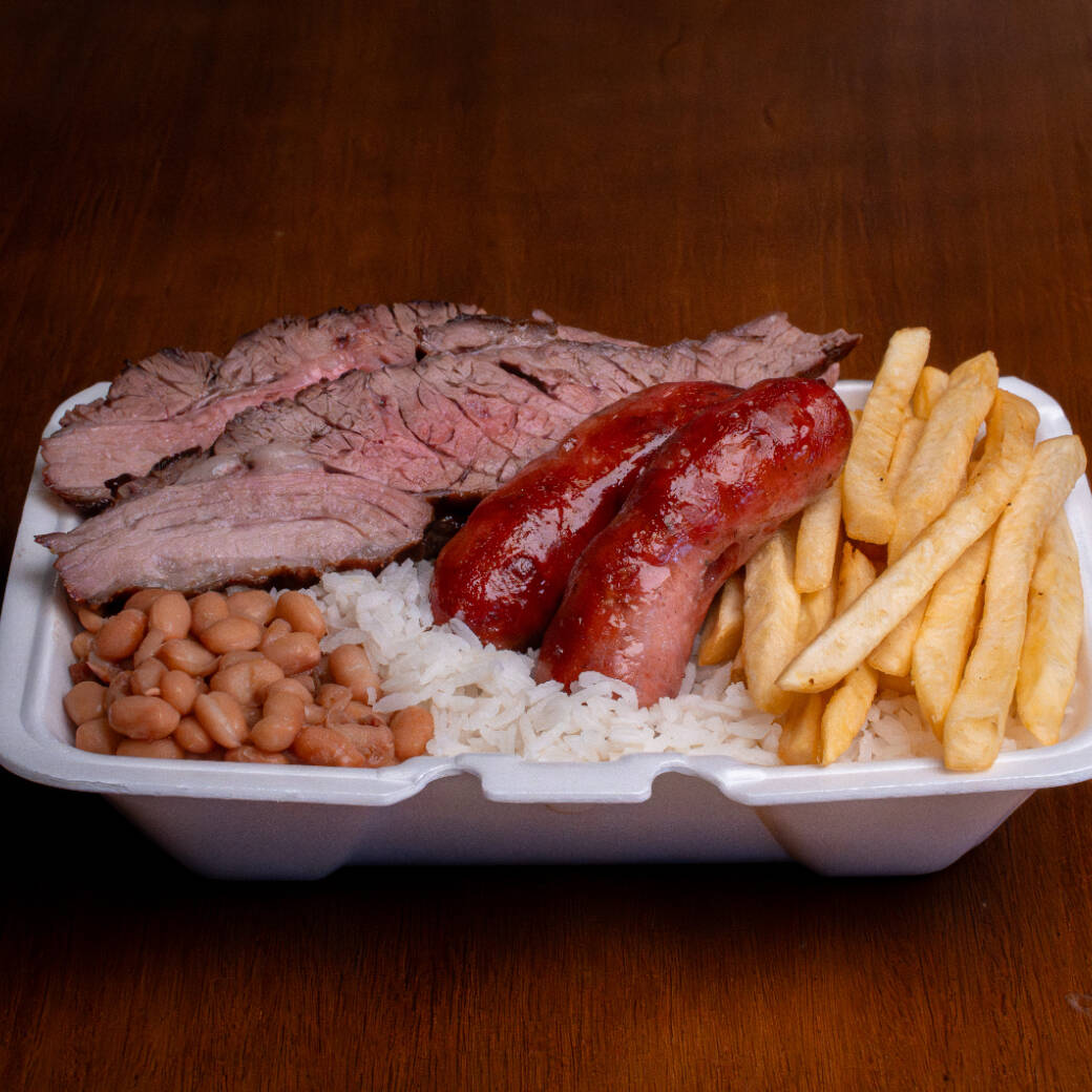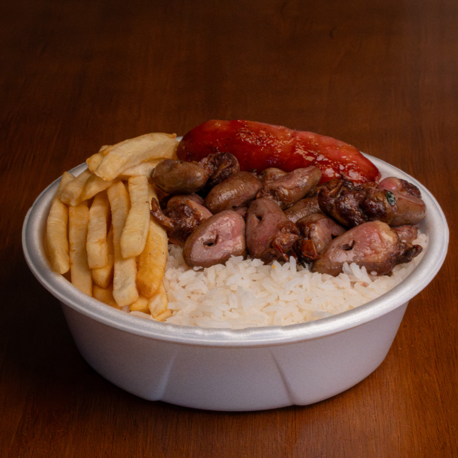 Coração e Linguiça assados na brasa, Arroz soltinho, Feijão bem temperado e Fritas (550g)