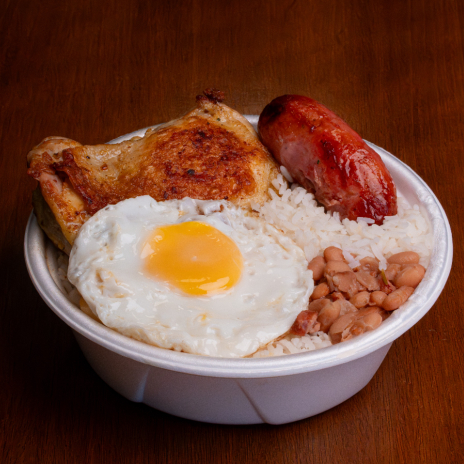 Filé de Sobrecoxa e Linguiça feitos na brasa e Ovo, Arroz soltinho, Feijão bem temperado e Espaguete alho e óleo (550g)
