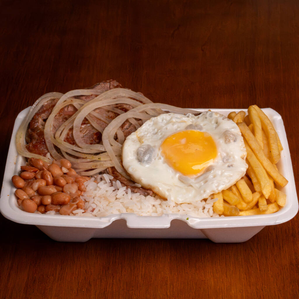 Bife Acebolado com Ovo, Arroz soltinho, Feijão bem temperado e Fritas (800g)