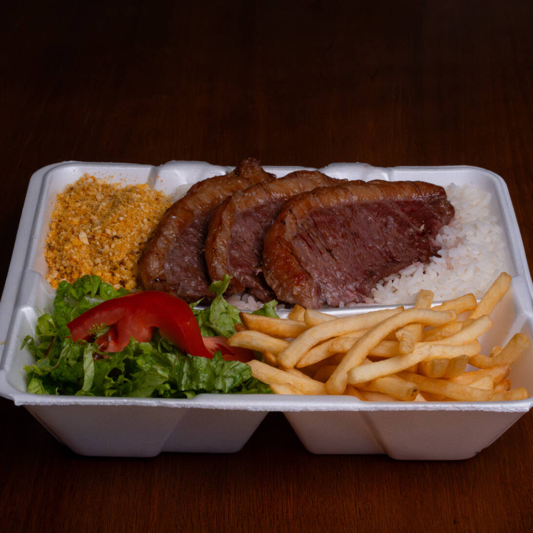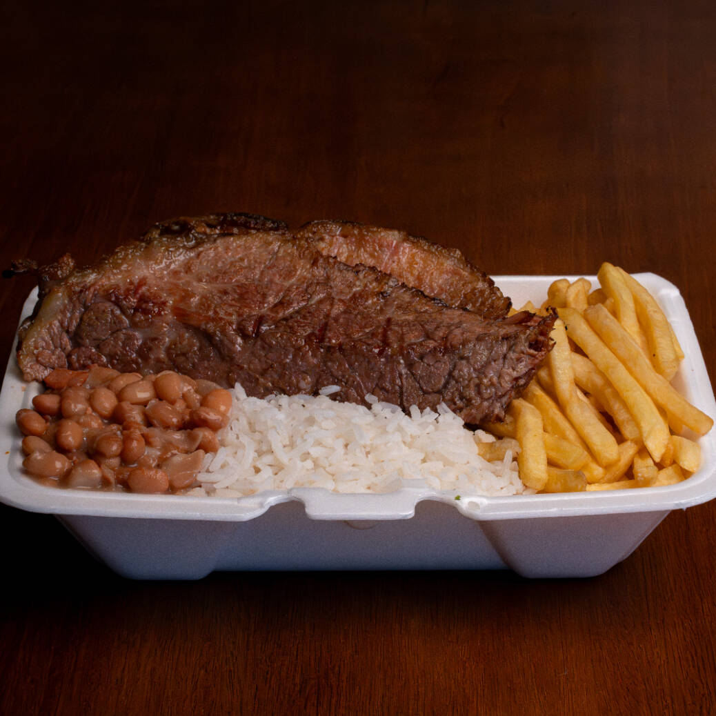 Três bifes de Picanha, Arroz soltinho, Feijão, Fritas, Farofa e Salada (tomate, alface e cebola)