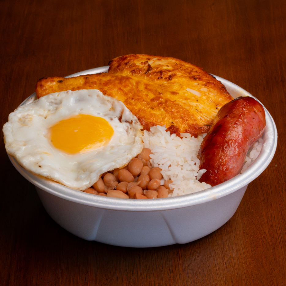 Filé de Frango feito na chapa, Linguiça assada na brasa, Ovo frito, Arroz soltinho, Feijão bem temperado e Fritas