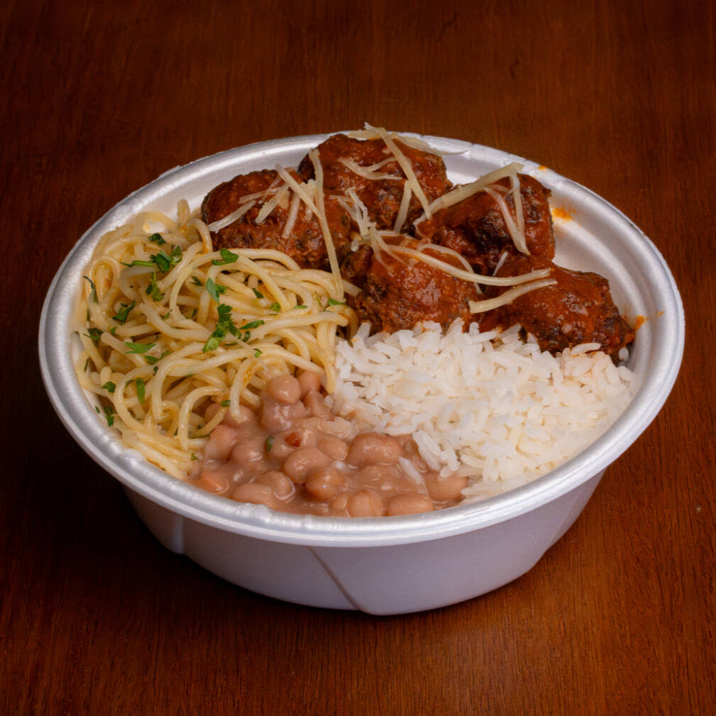 Almôndegas, Arroz soltinho, Feijão bem temperado e espaguete (550g)
