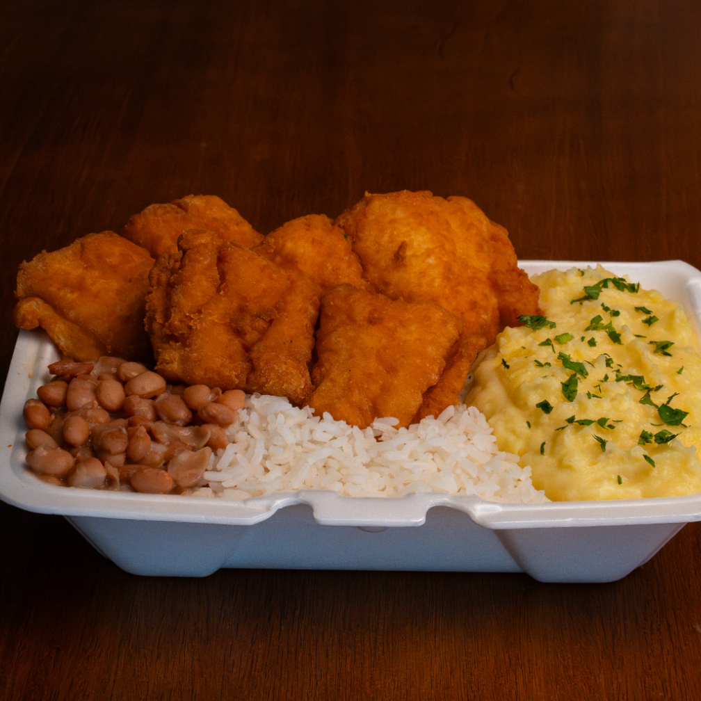 Filé de Peixe, Arroz soltinho, Feijão e Purê de Batata.