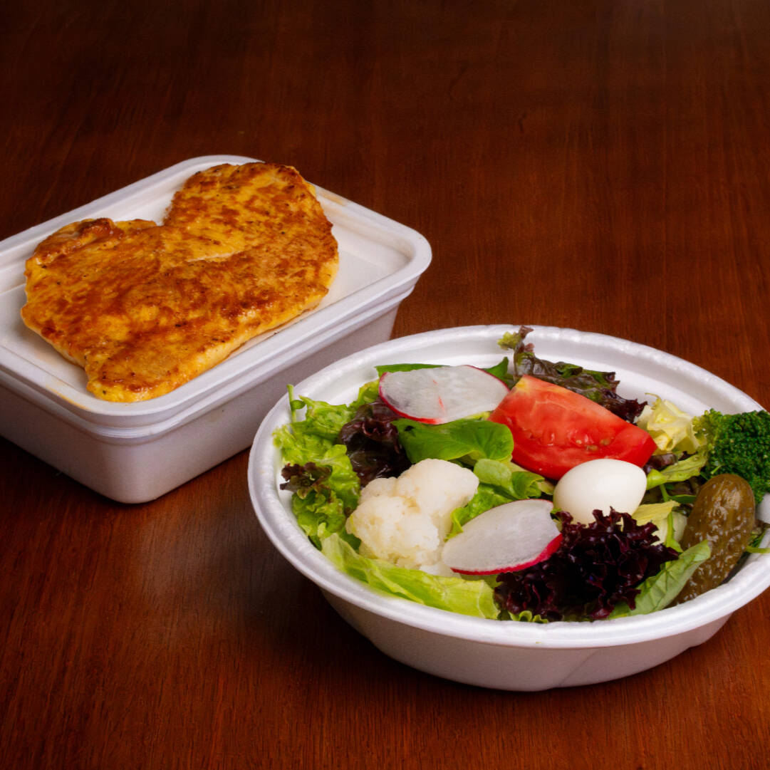 Dois Filés de Frango grelhados + Salada com alface, tomate, cenoura, brócolis, beterraba e ovo de codorna