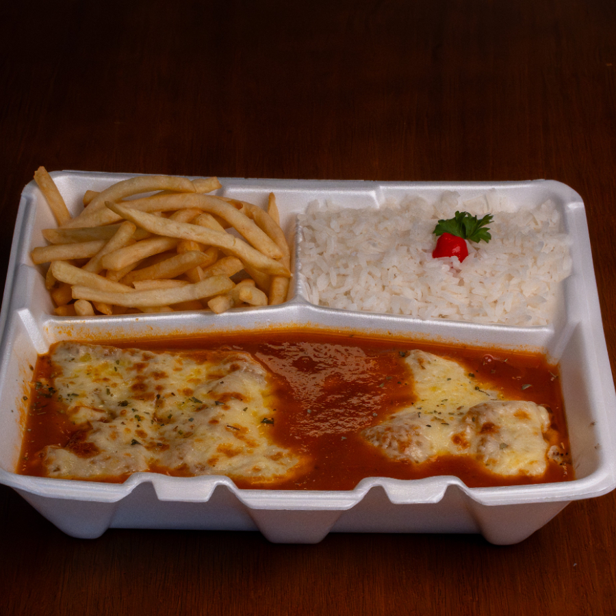 Parmegiana (carne ou frango), Arroz soltinho e Fritas