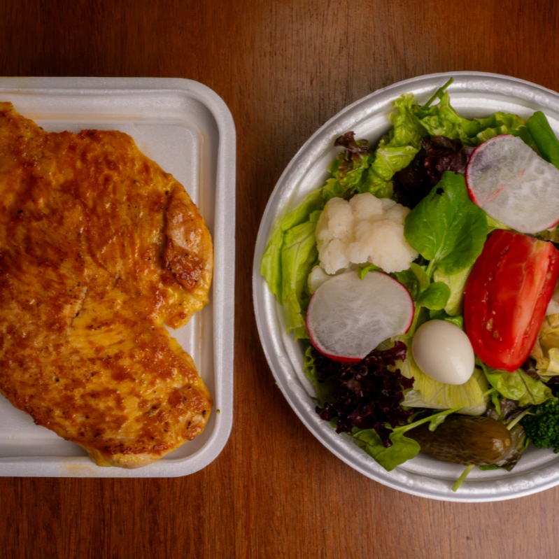 Salada com: alface, tomate, cenoura, brócolis, beterraba e ovo de codorna + 2 files de frango grelhados