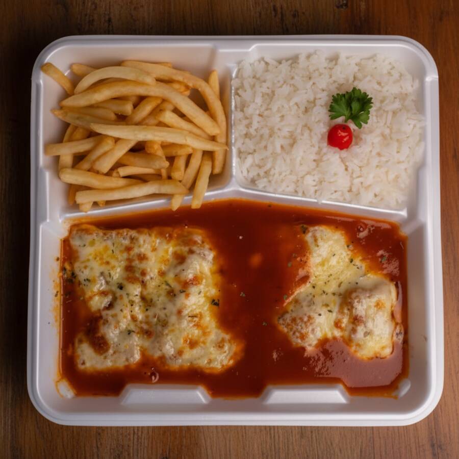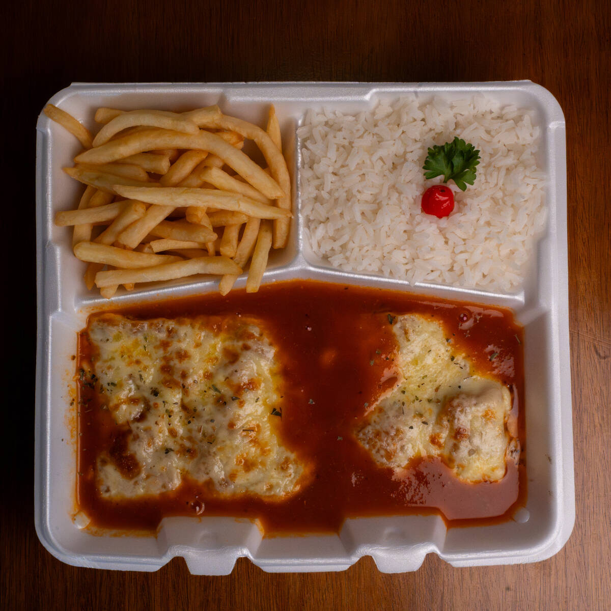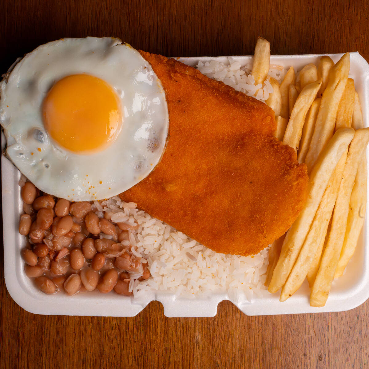 Filé empanado c/ Ovo, Arroz soltinho, Feijão bem temperado, Farofa e Fritas (800g)