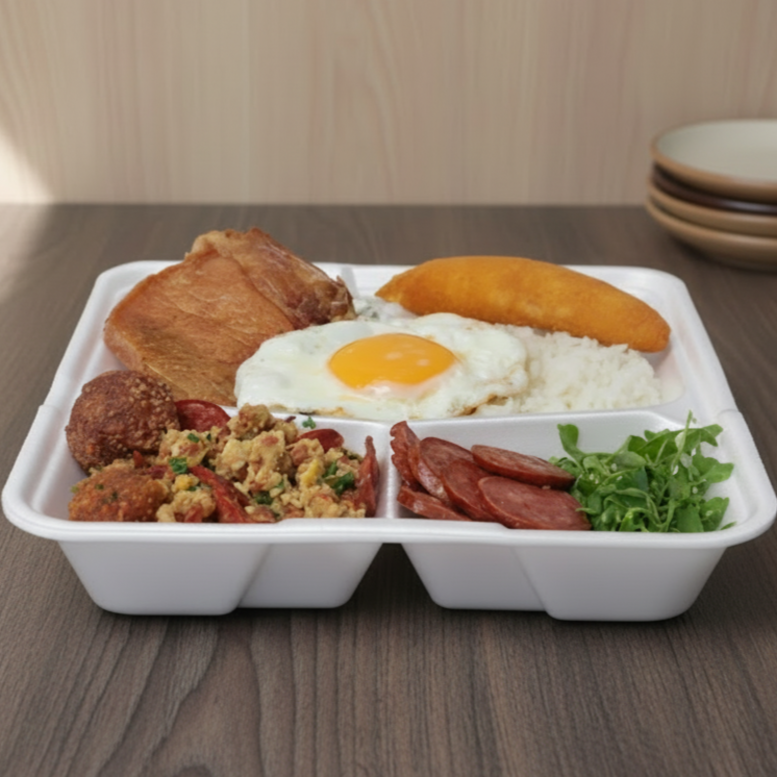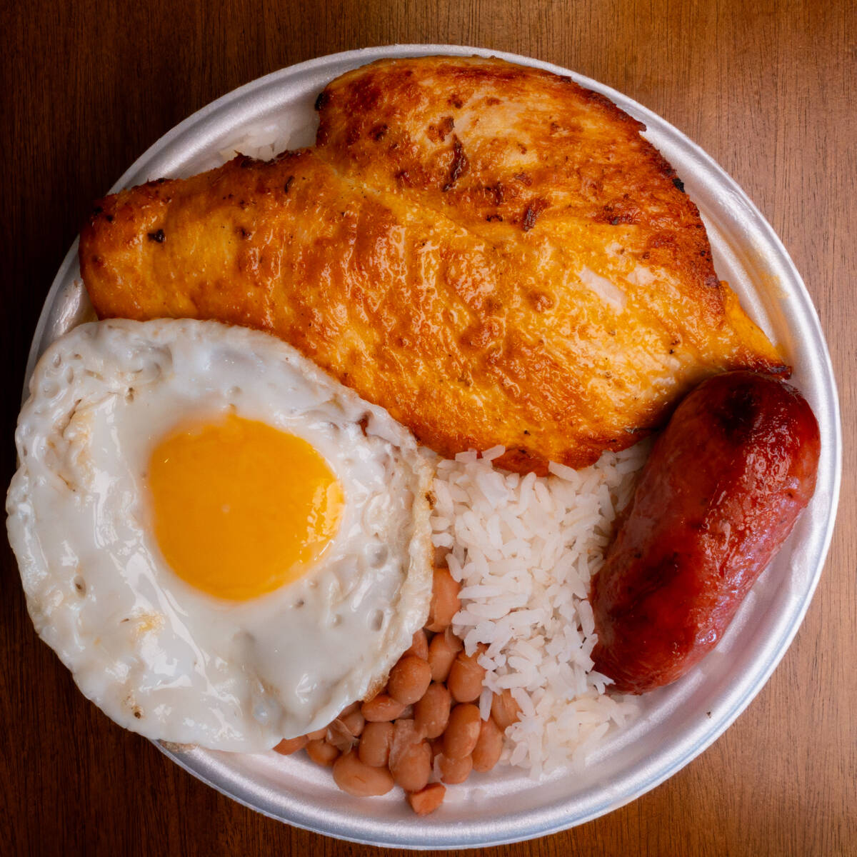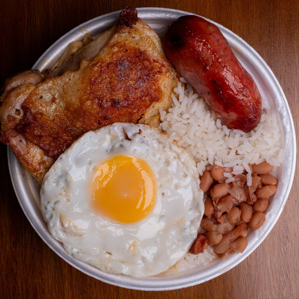 Filé de Frango feito na chapa, Linguiça assada na brasa, Ovo frito, Arroz soltinho, Feijão bem temperado e Fritas (550g)