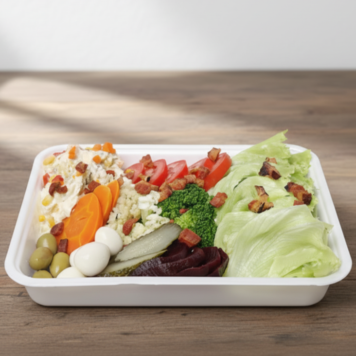 Alface, tomate, cenoura, brócolis, beterraba e azeitona