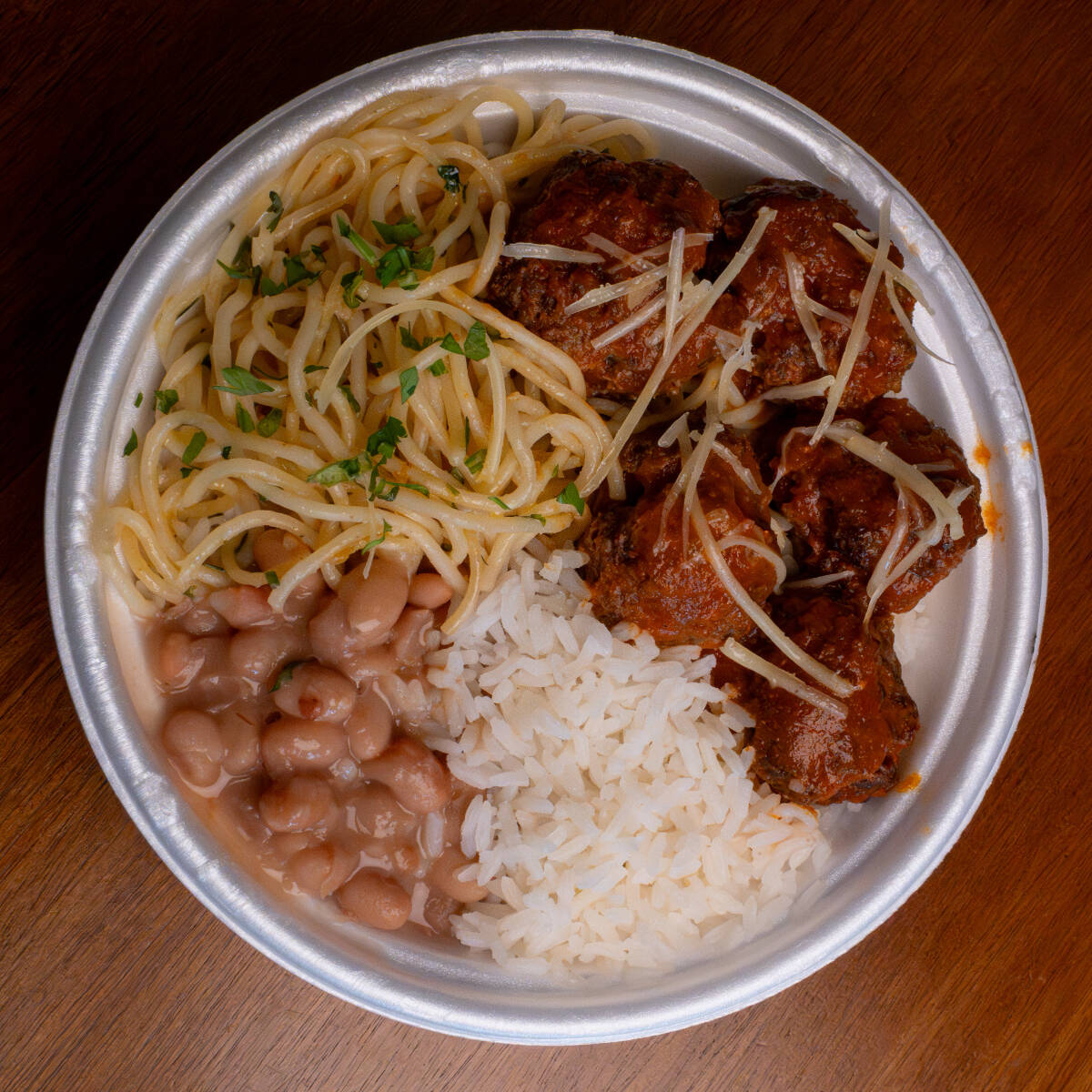 Almôndegas, Arroz soltinho, Feijão bem temperado e espaguete (550g)